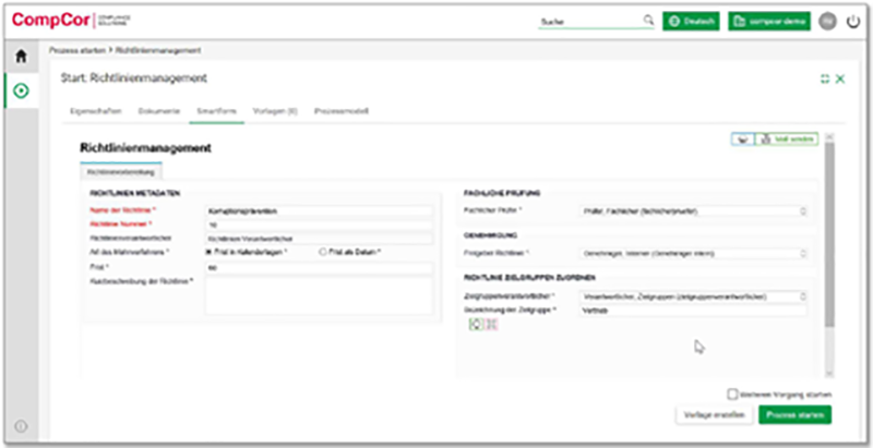Erfassung aller Metadaten der Richtlinie (Fachverantwortlicher, Genehmiger, Überprüfungsdatum, Wiederholung der Bestätigung etc.). Fachliche Freigabe- und Genehmigungsprozesse - Ausrollen von Richtlinien und Dokumenten sowie Einfordern von Bestätigungen